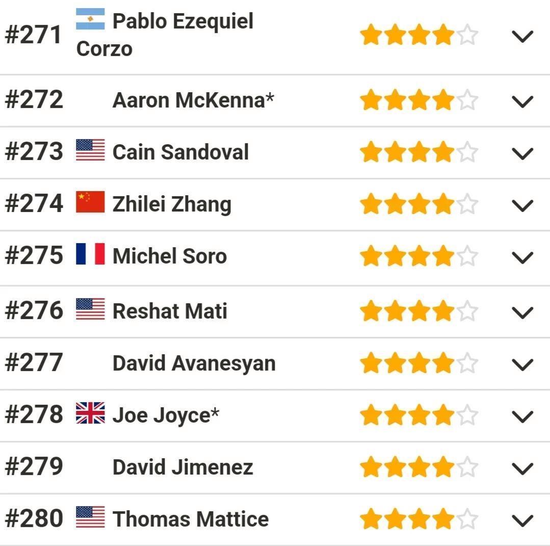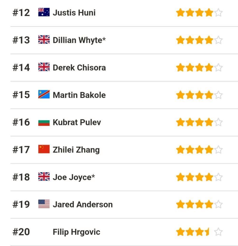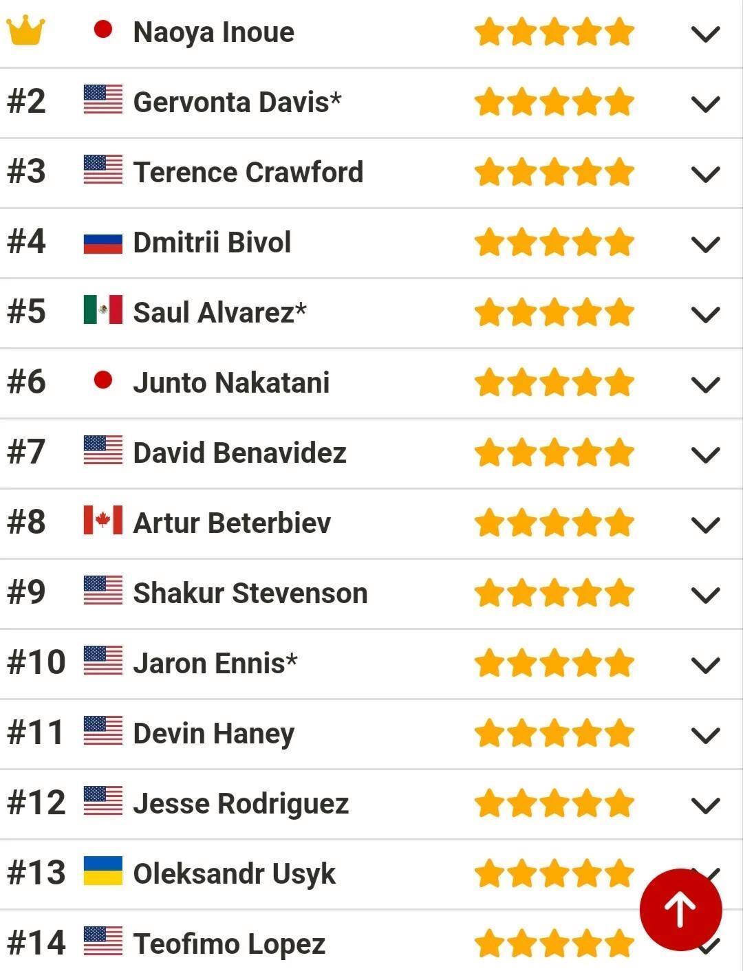 在这期榜单上,前10拳手辨别是井上尚弥、戴维斯、克劳福德、比沃尔、阿瓦雷兹、中古润东谈主、本纳维德斯、贝特比耶夫、史蒂文森和恩尼斯。而被视为现在分量级一哥的乌西克只排在第13,IBF冠军杜布瓦排在第26,卡巴耶尔第31,帕克第54,约书亚第70,泰森富里第78,张志磊第274。